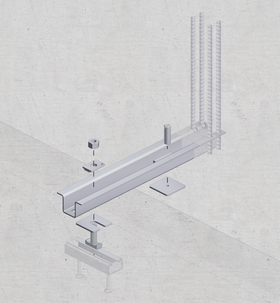 - Verankering aan de achterliggende betonconstructie door middel van een vooraf ingestorte ankerrail of een achteraf te boren ankerrail