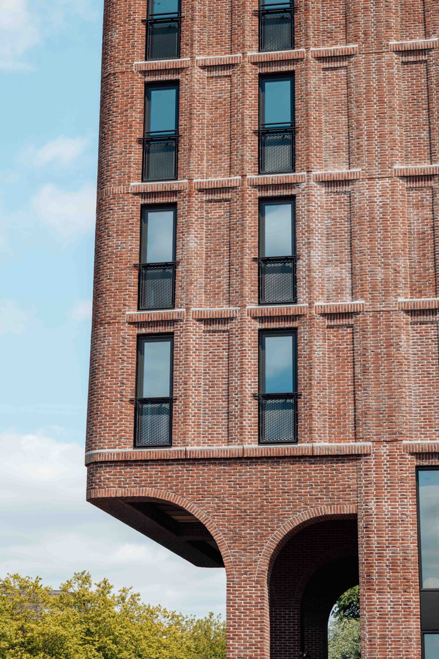 De verspringende rollagen boven de kozijnen vormden een mooie uitdaging voor onze engineering. Daarnaast zijn geveldragers in straal uitgewerkt voor het ronde metselwerk bij de gebouw hoeken. Het resultaat: een innovatief en creatief gevelontwerp dat de complexiteit van het project mooi oplost.